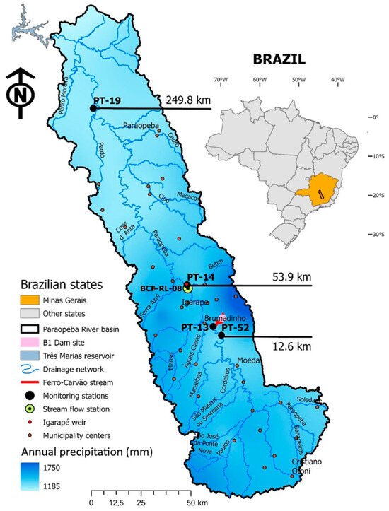 Figure 1. Map of Paraopeba River basin, with indication of major tributaries, municipality centers, position in the Brazilian state of Minas Gerais, and location of four water and sediment monitoring stations: PT-52 (“upstream”), PT-13, PT-14 (“anomalous”) and PT19 (“natural”), as well as one streamflow station BCF-RL-08, all used in the statistical assessment and artificial intelligence modeling of water–sediment interactions. The shaded areas describe the general precipitation increase from the mouth to the spring areas of the basin. The datasets of streamflow and water and sediment parameters are provided as Supplementary Materials.
