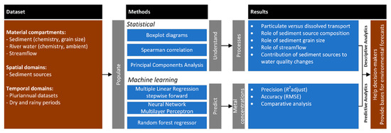 Taking the statistical and machine learning results altogether, the river model is expected to provide an assortment of insights about water–sediment interactions valid for the working spatial and temporal domains, which comprise the contribution of sediment source composition and grain size to changes in river water composition and the influence of streamflow discharge and environmental conditions on the type of transport (dissolved particulate). In similar work, these insights, together with the neural networks trained by the machine learning algorithms, will set up the basis for predictions of water composition as function of variations in streamflow and sediment characteristics. Thus, the river model as whole (Figure 2) provides a comprehensive assessment and a panoramic view over most factors controlling water–sediment interactions in a large river. It goes without saying that the specific methods used to implement the river model can change without compromising its structure or concept.