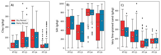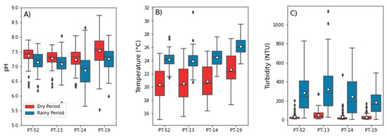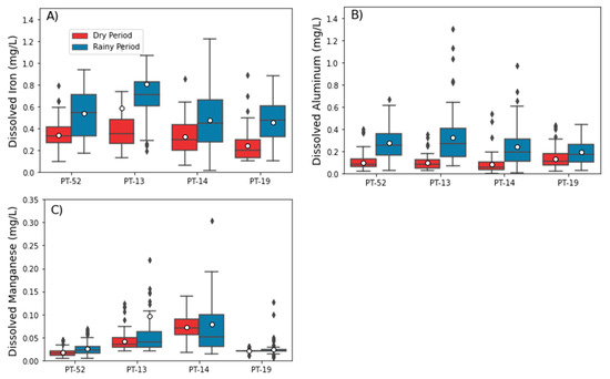 Figure 3. Boxplot diagrams of: (A) Fe(dis), (B) Al(dis) and (C) Mn(dis) concentrations in the dry and rainy periods of 2019 to 2021, measured at the “upstream” (PT-52), “anomalous” (PT-13 and PT-14) and “natural” (PT-19) monitoring stations.