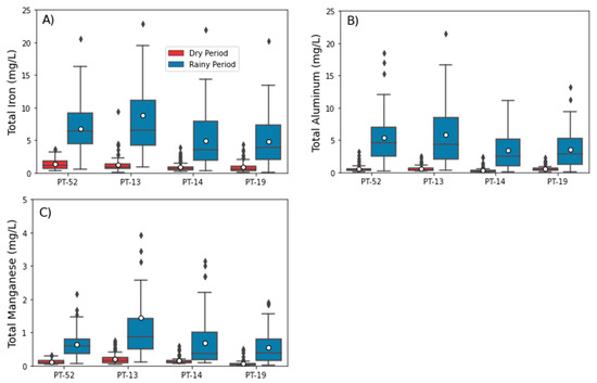 Figure 4. Boxplot diagrams of: (A) Fe(tot), (B) Al(tot) and (C) Mn(tot) concentrations in the dry and rainy periods of 2019 to 2021, measured at the “upstream” (PT-52), “anomalous” (PT-13 and PT-14) and “natural” (PT-19) monitoring stations.