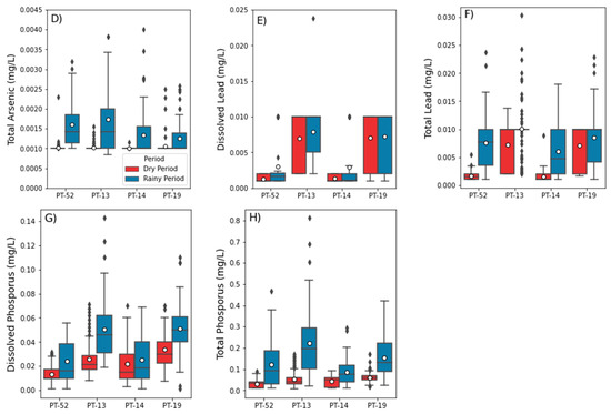 Figure 5. Boxplot diagrams of ambient conditions and contaminants other than Fe, Al and Mn dissolved and total concentrations in the water of Paraopeba River: (A) pH, (B) temperature, (C) turbidity, (D) total arsenic, (E) dissolved lead, (F) total lead, (G) dissolved phosphorus, (H) total phosphorus, in the dry and rainy periods of 2019 to 2021, measured at the “upstream” (PT-52), “anomalous” (PT-13 and PT-14) and “natural” (PT-19) monitoring stations.