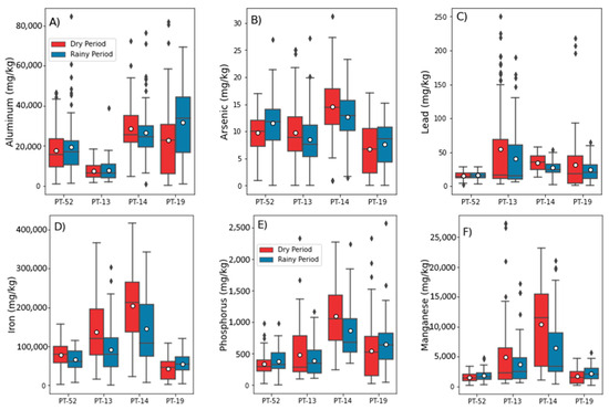Figure 6. Boxplot diagrams of compartment (E) variables, which are related to the chemical composition of sediments + tailings mixtures: (A) aluminum, (B) arsenic, (C) lead, (D) iron, (E) phosphorus and (F) manganese, in the dry and rainy periods of 2019 to 2021, measured at the “upstream” (PT-52), “anomalous” (PT-13 and PT-14) and “natural” (PT-19) monitoring stations.