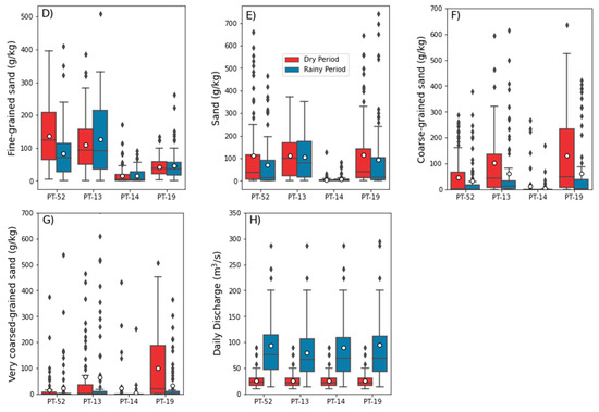 Figure 7. Boxplot diagrams of (F) compartment variables (Table 1), which are related to the granulometric fractions of sediments and tailings: (A) clay, (B) silt, (C) very fine-grained sand, (D) fine-grained sand, (E) sand, (F) coarse-grained sand, (G) very coarse-grained sand. Boxplot diagram of (D) compartment variable: (H) river flow. The dry and rainy periods between 2019 and 2021 were considered, as well as the “upstream” (PT-52), “anomalous” (PT-13 and PT-14) and “natural” (PT-19) monitoring stations.