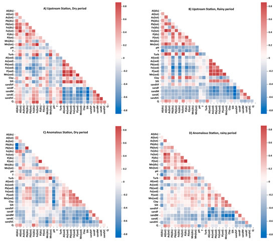 Figure 8. Spearman’s rank-order correlations between all variables listed in Table 1, computed at the “upstream” (panels (A,B)) and “anomalous” PT-13 (C,D) monitoring stations, in the dry and rainy periods.