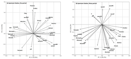 The results of principal component analysis (PCA) provided joint information (multivariate) about the list of parameters represented in Table 1, allowing a deeper understanding on the interactions among the defined compartments. The PCA was run four times, considering the combinations of monitoring stations and seasons, namely the “upstream” and “anomalous” stations and the dry and rainy periods. The dataset variability at the “upstream” station in the dry period, was explained in 50% by the components PC1 and PC2. Ata the same station, but in the rainy period, the percentage was 48.3%, while the “anomalous station” reached values of 40.6% and 46.3% for the dry and rainy periods, respectively (Figure 9).