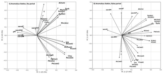 Figure 9. Principal component analysis (biplots) of all parameters listed in Table 1: (A) “upstream” station in the dry period; (B) “upstream” station in the rainy period; (C) “anomalous” PT-13 station in the dry period; (D) “anomalous” PT-13 station in the rainy period.