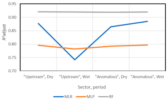 Regarding the artificial intelligence methods, it is worth referring to the performance of existing algorithms, which can be very different depending on the method’s complexity and data quality [51]. In the present study, we selected multilayer perceptron neural networks and random forest regressor, using the same variables as those resulting from the stepwise selection of MLR models. Regardless of the model, the dissolved and total concentrations of aluminum, iron and manganese in water were used as targets (dependent variables; namely, Al, Fe and Mn from Table 1) and the remaining parameters included in the working dataset as features (independent variables; i.e., the other variables listed in Table 1). The multilayer perceptron (MLP) neural network model was chosen for this work because it allows training on nonlinear problems, although it has training difficulties due to local minimum problems and has a large number of hyperparameters, as mentioned in [52]. The Random Forest (RF) regressor model was chosen because it is very flexible in regression problems, for combining a collection of decision trees and being robust in relation to outliers. Its training is slower when compared with other machine learning algorithms, but the results are more precise and accurate [53]. The training method was identical for all models and cross-validation with 3 folds was used. The precision of all machine learning methods was assessed by the R2Adjust (Equation (1)), as proposed by [54]: