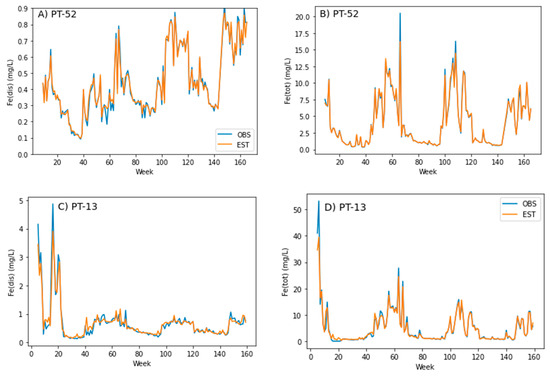 The feature variables selected for the MLR models differed according to the target variable, namely for the total and dissolved concentrations of aluminum, iron and manganese. They are indicated in Table A1 of Appendix A and accompanied by the corresponding fitting parameters. For example, to estimate the dissolved Al at the “upstream” station, considering the joint dry and rainy periods, the fitted equation was (Equation (3)):