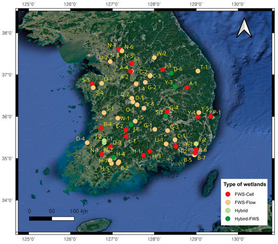 A total of 63 CWs monitored from 2016 to 2022 were analyzed in this study to identify proper measures for improving the management of different CWs in Korea. Korea has a total land area of 1,061,089 km2, 46.5% and 16.6% of which are agricultural and urban areas, respectively Among the monitored CWs, 35, 15, and 13 CWs were developed to manage NPS pollutants from agricultural, urban, and livestock areas, respectively, as exhibited in Figure 1. Detailed characteristics of the CWs monitored in this study are listed in Table 1. These CWs were constructed from 2010 to 2022 with an average catchment area of 4.731 to 6005 ha and an average volume capacity per day ranging from 198 to 60,000 m3/day, designed to treat NPS pollutants from various land use types. Different types of constructed wetlands, including combined cell-type free-water surfaces (Cell-FWSs), flow-type free-water surfaces (Flow-FWSs), hybrid type free-water surfaces (Hybrid-FWSs) and hybrid constructed wetlands (Hybrids), were designed in different parts of Korea. The configuration and description of the CWs monitored in this study were described by Choi et al., 2021 [5].