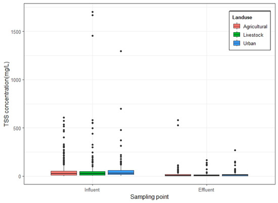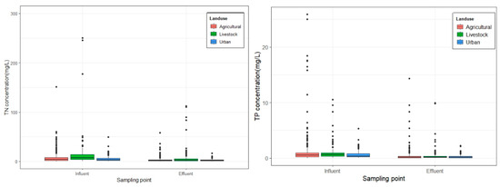 Figure 4 shows a comparison between influent and effluent TN and TP concentrations in CWs treating different land uses. The greatest influent TN concentration was 15.35 ± 33.71 mg/L, which was reduced to 7.60 ± 17.64 mg/L in the effluent after treatment in a CW for livestock land use. The influent TN concentration in agricultural areas was 7.43 ± 11.69 mg/L, while the effluent TP concentration was 3.45 ± 5.28 mg/L. Lastly, the influent TN concentration in an urban area was found to be 5.40 ± 5.76 mg/L and was reduced to 2.79 ± 2.53 mg/L after treatment through a CW. The highest TN concentrations in livestock areas were attributed to feed inputs, livestock manure inputs, and fixed runoff and soil leaching in forested areas [63,64]. On the other hand, influent TP concentrations amounting to 1.23 ± 2.95 mg/L, 1.05 ± 1.57 mg/L, and 0.59 ± 0.69 mg/L were reduced to 0.43 ± 1.20 mg/L, 0.48 ± 1.29 mg/L, and 0.26 ± 0.33 mg/L after treatment in CWs for agricultural, livestock, and urban land uses, respectively. Compared to TN, TP was generated more in agricultural areas because TP inflow in rural areas comes from chemical fertilizer use and is distributed to water bodies through the water flow of irrigation. The application of CWs to reduce pollutants from these sources is considered an efficient way to manage and reduce nutrient loads and prevent eutrophication. In addition, N is generated by fuels used by businesses in urban areas, including automobile usage, power plants, and other human activities, causing wastewater production. It is suggested that proper management is necessary to ensure that the treatment mechanism incorporated in the CWs is well implemented considering the pollution source. A proper basin management plan to reduce NPS pollution is needed to ensure nutrient management in large basins.