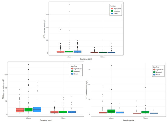 Figure 5 shows ae comparison of influent and effluent concentrations of the BOD, COD, and TOC in the CWs constructed in each land use type. Influent BOD, COD, and TOC concentrations in agricultural areas were 11.0 ± 14.7 mg/L, 17.5 ± 14.6 mg/L, and 7.42 ± 10.26 mg/L, which were reduced by CWs to 5.03 ± 5.92 mg/L, 8.6 ± 6.7 mg/L, and 4.37 ± 5.33 mg/L in the effluent, respectively. The influent BOD, COD, and TOC concentrations from the livestock area amounting to 19.3 ± 45.3 mg/L, 25.2 ± 32.2 mg/L, and 13.6 ± 21.2 mg/L were reduced by the CWs to 6.8 ± 11.2 mg/L, 10.6 ± 10.0 mg/L, and 11.3 ± 19.6 mg/L, respectively. Lastly, the influent BOD, COD, and TOC concentrations found in urban areas amounting to 13.6 ± 15.9 mg/L, 22.3 ± 20.3 mg/L, and 6.49 ± 5.6 mg/L were reduced to 6.15 ± 8.80 mg/L, 9.82 ± 8.74 mg/L, and 4.15 ± 3.29 mg/L, respectively.