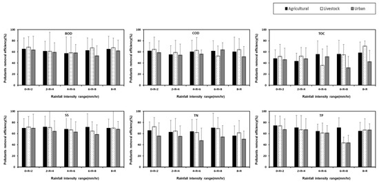 Rainfall characteristics (rainfall amount, rainfall intensity, rainfall duration, etc.) are important for the design and operational management of CWs. Rainfall characteristics affect the capacity calculation, efficiency diagnosis, and maintenance frequency of CWs. Among rainfall characteristics, rainfall intensity has a significant correlation with runoff load [71,72]. In addition, the nature of pollutants entering CWs is a factor influenced by the land use of the watershed, which is important for CW design. Figure 6 shows the NPS pollutant removal efficiency at varying rainfall depth ranges. The average BOD removal efficiency is 62%, with the highest reduction efficiency in the rainfall range of 60 to 80 mm (69%) for agricultural areas, 0 to 20 mm (67%) for livestock areas, and 20 to 40 mm (62%) in urban areas. Considering the COD, the highest removal efficiency was found in agricultural areas between 60 and 80 mm (63%), while 64% and 63% removal efficiencies were found in agricultural and urban CWs for rainfall events below 20 mm. Similar to the COD, the TOC concentration in livestock and urban CWs showed high removal efficiencies under 20 mm, while agricultural CWs were found to have a high removal efficiency under 60 mm of rainfall. Considering the COD and TOC, it was found that the removal efficiency is high even for storm events with high rainfall depths, which is attributed to the flow of substances attached to particulate matter into the facility. The removal of most of these water quality parameters, such as TP, which was associated with particulate matter, was found to be related to the physical removal of particulate contaminants and bound or adsorbed contaminants. In addition, most of the study sites have short HRTs due to the shape and structure of CWs causing limitations in creating a biochemical treatment environment that contributes to the removal of dissolved organic matter and TN. In the case of TSS, the overall removal efficiency was higher than that of other pollutants. It was also found that TSS removal was higher for lower rainfall events for all land uses. This is because the particle load reaches a constant or stable state above the critical load [73,74]. Nutrients such as TN and TP also showed high removal efficiencies at rainfall events below 20 mm. High pollutant-reduction efficiencies were found for low rainfall depths of 20 mm or less because the pollutants that entered the CWs during low rainfall were largely removed by the long HRTs. As rainfall increases, the pollutant reduction effectiveness decreases somewhat because the HRTs in the CWs become shorter, which does not allow adequate time for treatment [28,75].