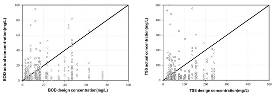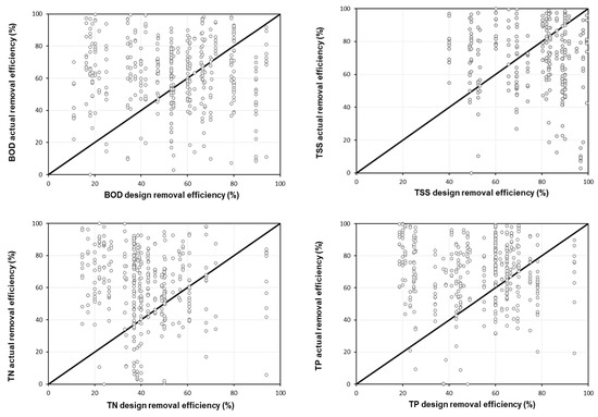 A comparison of design efficiency with actual efficiency for target pollutants in CWs is provided in Figure 8. On average, 70.2% of the CWs were found to have a higher efficiency compared to the actual efficiency for all the target parameters, while 29.8% of the CWs were found to have a lower actual efficiency compared to the design efficiency. Considering each target pollutant, 65%, 61%, 78%, and 77% of the CWs were found to have a higher actual removal efficiency compared to the design removal efficiencies for the BOD, TSS, TN, and TP, respectively. Overall, the deviation of the design removal efficiency from the actual removal efficiency was large. Specifically, the BOD was found to have similar design efficiency and actual efficiency values, while TSS were evaluated to have an overestimated design efficiency. For TN and TP, the design efficiencies were either too high or set in a wide range, and the actual efficiencies were more stable than the design efficiencies. However, in the case of TN and TP, it was found that negative efficiencies can occur at low concentrations. Therefore, when designing CWs, the design efficiency should be calculated based on the characteristics of the watershed and the influent pollutants’ characteristics.