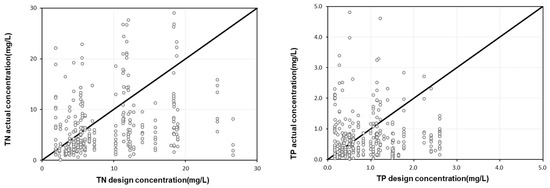 CWs discharge pollutants in different concentrations and patterns depending on meteorological and watershed characteristics such as rainfall, watershed characteristics, and background concentrations. In addition, the monitoring data available for the design of NPS management technologies is insufficient, and different designers use different monitoring data for each technology, resulting in large deviations in the inflow concentration and mitigation efficiency of technologies after design. Figure 7 shows a comparison of the actual influent concentrations and the design influent concentrations of the monitored CWs. For the comparison of actual and design influent concentrations, the BOD, TSS, TN, and TP were set as design parameters. Considering the overall influent concentrations entering CWs, it was found that 67.5% of the influents were entering at a lower concentration and 28.5% were entering at a higher concentration compared to the design influent concentration. For each target pollutant, 69%, 66%, 71%, and 68% specifically for the BOD, TSS, TN, and TP, respectively, were found to be below the design influent concentration, while about 29% to 35% were above the design influent concentration. This finding was attributed to the varying watershed characteristics and weather characteristics including rainfall and rainfall intensity. In addition, it was found that the actual inflow concentrations of all pollutants except TP were very low compared to the design inflow concentrations. To derive stable CW efficiency, it is important to use appropriate influent design concentrations. Specifically, lower influent design concentrations should be used for the BOD, TSS, and TN, and a slightly higher design concentration for TP is necessary for the design.