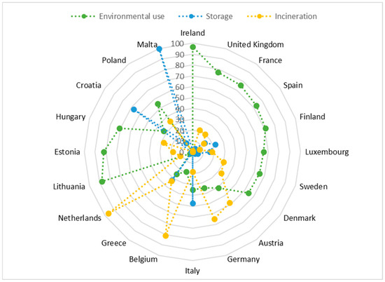 Percentage representation of sludge handling in EU countries as of 2020 [14].