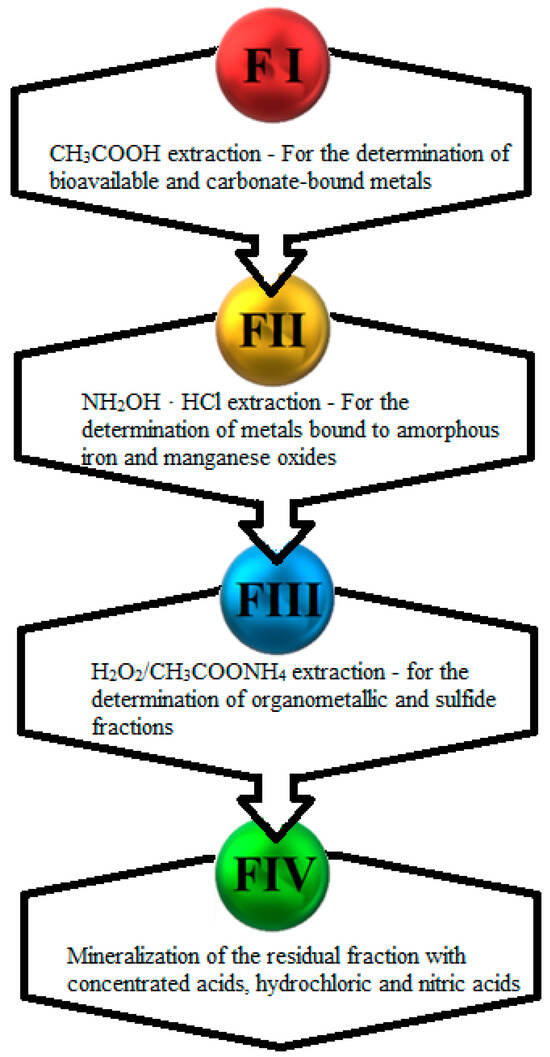 The best results for sewage sludge samples were obtained using a four-step procedure developed by the European Community Bureau of Reference, abbreviated BCR [42,43]. Initially, classical BCR was a three-step process. Nowadays, after modifying the method by introducing royal water mineralization, four fractions of heavy metals can be separated: ion-exchangeable (carbonate), bound to iron and manganese oxides (reducible), bound to organic matter (oxidizable), and residual matter [44,45,46]. The BCR method has been applied in many studies on the quality of sewage sludge and heavy metal-contaminated soils. The technique makes it possible to assess the mobility of metals in the studied matrix and estimate the risk of spreading contaminants into the environment [47]. The course of the BCR procedure is shown in Figure 3. Digestion with aqua regia (HCl + HNO3) was used in the soil samples to determine the total heavy metal content.
