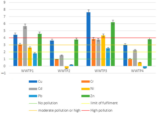 The concentration of heavy metals at the potential site significantly influences the Igeo index. In the case of sludge extracted from WWTP1 and WWTP3, the Igeo index indicated notably high levels of contamination, particularly for copper, zinc, cadmium (in WWTP1), and nickel (in WWTP3). Conversely, for WWTP2 and WWTP4, lead and nickel were the only heavy metals that did not contribute to contamination (as depicted in Figure 4). Notably, the Igeo values for nickel from WWTP2 and lead from WWTP4 registered as negative, indicating that the sewage sludge metal content was lower than that found at the intended site of use. This underscores the difference in metal concentrations, emphasizing lower levels within the sediments than expected at the site of potential application.
