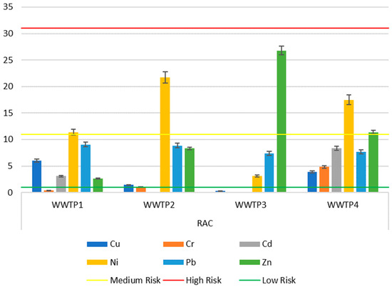 The RAC index is the first indicator that considers the speciation of heavy metals, but it only considers the content in the FI fraction and the total content of the element in question. RAC reached a medium risk value for nickel in all cases and for zinc in cases of sludge taken from WWTP3 and WWTP4 (Figure 6). None of the heavy metals reached a high risk of pollution due to the low concentration of metals within the FI fraction.