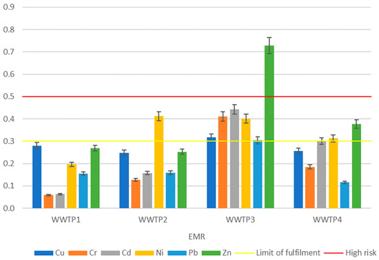 In contrast to RAC, the ERD and EMR indices consider the mobility of metals in fraction I and fractions II and III. Among these indices, the ERD index emerged as a more comprehensive assessment of the analyzed sewage sludge. Specifically, the ERD index highlighted a notable risk of contamination primarily associated with copper (at WWTP1 and WWTP3) and zinc (at WWTP3) (as depicted in Figure 7). Conversely, according to the EMR index, the high-risk threshold was surpassed solely by zinc in the sewage sludge obtained from WWTP3 (as illustrated in Figure 8).
