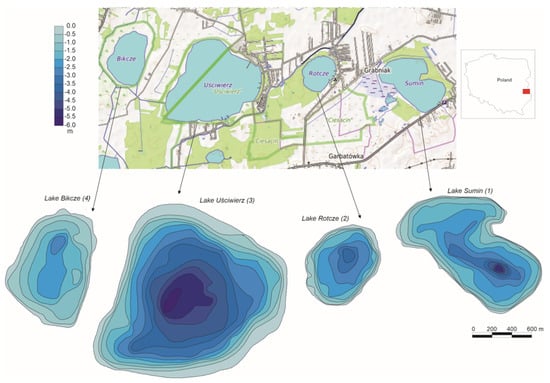 The volumes of the Uściwierz Lakes were obtained from bathymetric plans conducted on ice in the winter of 2017 and 2018. The depths were measured using a weight probe, while the locations of points were marked using a GPS receiver under clear sky conditions. In the larger lakes (Uściwierz, Sumin, and Bikcze Lakes), the depth was sampled every 200 m; in the smaller lakes (Lake Rotcze), every 100 m, the points were evenly distributed to cover both the deepest part of the lake basin and the near-shore areas. All of the bathymetric calculations were made using Didger 5.0 and Surfer 25 computer programs.