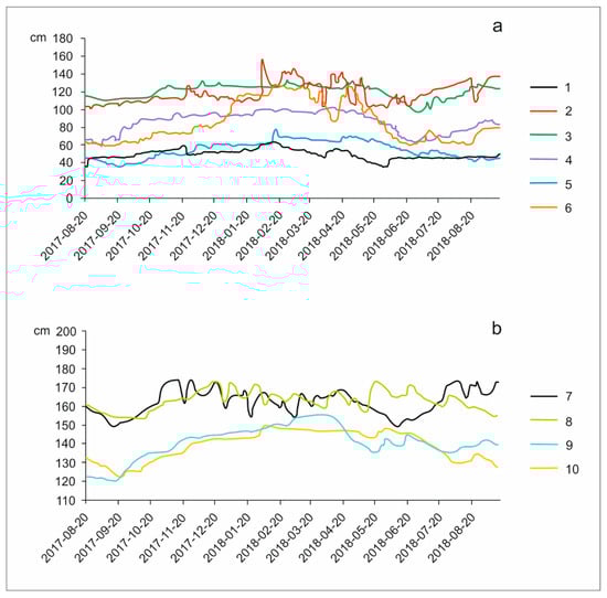 Water level (cm) fluctuation of: (a) streams and (b) lakes. 1—inflow into Bikcze Lake; 2—outflow from Bikcze Lake; 3—inflow into Rotcze Lake; 4—western inflow into Sumin Lake; 5—Southern inflow into Sumin Lake; 6—outflow from Sumin Lake; 7—Sumin Lake; 8—Rotcze Lake; 9—Bikcze Lake; 10—Uściwierz Lake.