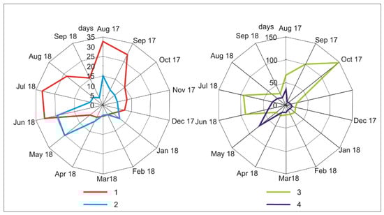 In Lake Sumin, the time of water exchange ranged from four to 39 days and was the most stable among the studied lakes. Water renewal in Lake Rotcze was the least stable, taking from two to 386 days. Lakes Uściwierz and Bikcze exhibited a similar exchange rate during the study period, from three to 149 days and from one to 144 days, respectively. In the case of Lakes Sumin and Rotcze, the longest time of water exchange occurred in the early autumn of 2017 and the summer of 2018, while in the case of Uściwierz and Bikcze, extremes occurred about a month earlier (Figure 3).