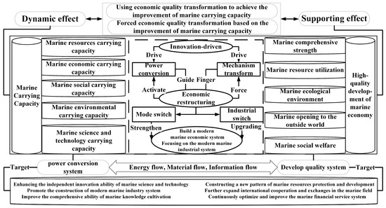Academics generally believe that the carrying marine capacity is a significant basis for the judgement of marine development. The MCC emphasises the sustainable use of marine resources and the ability to support economic and social development, and this carrying capacity makes the marine environment able to support the coordinated development of society, economy, resources, and environment [30,31]. Indicators that characterise the carrying capacity include the marine ecological capacity, the ability to supply inventory, and the degree of industrial development, through which the coastal socio-economic situation can be further analysed, thus enriching and deepening the cognition and understanding of the carrier (marine resources and environment), the carrying object (socio-economics), and the external environment (science, technology, innovation, and management) of the carrying capacity of the marine environment and resources, which will help to achieve the healthy development of marine ecosystems [32]. “The ocean is a strategic place for high-quality development”, and refers to the process of production and life in the marine field; the human demand for a preferable life is met, the allocation of resource factors and output is efficient, the value of scientific development and technological upgrading is constantly improving, and the quality of products and services continues to grow, focusing on the coordinated development under the new concepts of development, such as innovation, coordination, greenness, openness, and sharing. Therefore, the MCC and MEHD are complementary but also have synergistic interaction, coordination, and symbiosis, and this paper uses the two interactive relationships as the main line to build the MCC and MEHD interaction mechanism analysis framework (Figure 2).