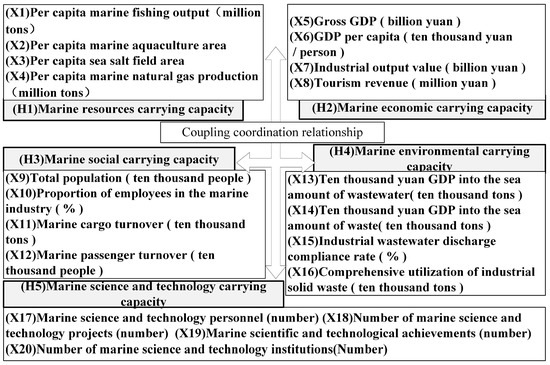 We refer to the connotation and mechanism analysis of the MCC, with reference to the Guidelines on the Indicator System and Technical Methods for Monitoring and Early Warning of the Carrying Capacity of Marine Resources and Environment issued by the State Oceanic Administration in 2015 [35], and the Technical Procedures for Assessing the Carrying Capacity of Marine Resources in Nearshore Areas [32], a local standard issued by the Shandong Provincial Bureau of Quality and Technical Supervision, in 2017. Considering the current situation and characteristics of marine natural resources and integrating supply and marine resource demand factors, the MCC system is divided into five subsystems: marine resource carrying capacity, marine economic carrying capacity, marine social carrying capacity, marine environmental carrying capacity, and marine scientific and technological carrying capacity [36], and the indicator system is shown in Figure 3.