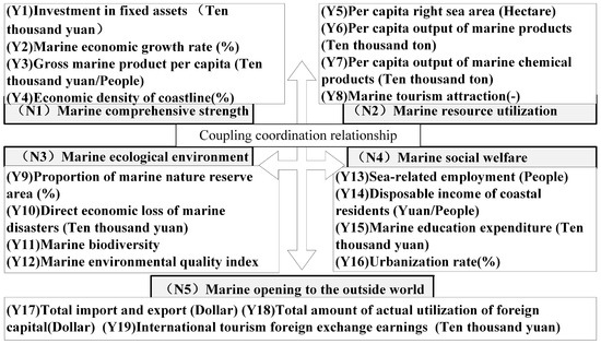 The MEHD is a complex and comprehensive system, taking into account economic development, resource use, ecological environment, social welfare, and other aspects of integrated and coordinated development [37]. Based on the connotation and characteristics of high-quality development, following the concept and the law of marine economic development, the development objectives are marine economic growth, optimising and upgrading its structure, improving the output of ocean resource use and allocation, giving attention to the level of marine ecological environmental protection, ameliorating the level of openness of the marine economy, and improving the performance of social welfare [38]. To evaluate marine resource utilisation, marine ecological environment, marine openness to the outside world, and marine social welfare, an evaluation index system was constructed (Figure 4).