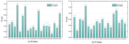 The main principle is to first determine the indicator weights using the objective evaluation entropy weighting method and then use the TOPSIS model to measure and evaluate the MCC and the high-quality development index. Firstly, the indicator data are standardised in the formula; then, the information entropy of each indicator is calculated in the formula, and objective weights are obtained in the equation, as shown in Figure 6.