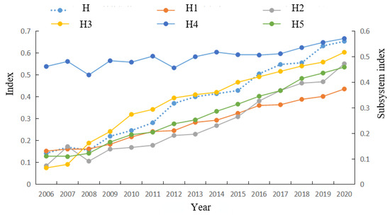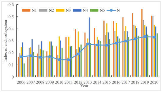 Based on the index and the constructed evaluation index system, an evaluation chart of China’s MEHD index by dimension from 2006 to 2020 was drawn (Figure 9).