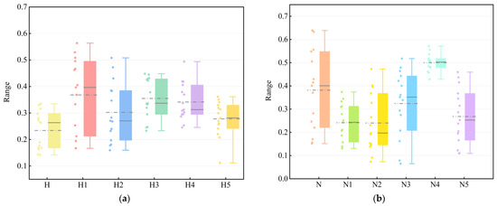 A box plot used to display a set of data dispersion is further used to analyse the MEHD index (Figure 8b). It can be found in Figure 8b that the distribution of H4 and H1 is relatively concentrated, while the distribution of H2 is relatively dispersed. Among the sub-dimensional indicators of the MEHD, the H4 distribution is the most uniform, and the H3 distribution is the most uneven. This information can be obtained by comparing the distance from the median to the upper quartile and the lower quartile. It shows that high-quality opening up is an important driving force for the MEHD. The MEHD requires the coordinated use of domestic and international markets, resources, and technologies to improve the quality of opening up and the development linkage. H3 is the best, and the overall situation of H2, H3, and H5 is not ideal. This information can be obtained from the median position, and the analysis data can be found. Innovation is the key to promoting the MEHD. The purpose is to produce greater social welfare, and the sharing of results is an essential requirement for the benefit of the people.