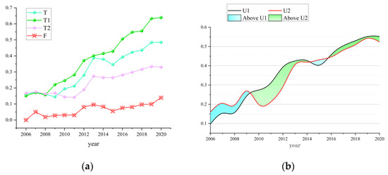 where F is the synergy, is the stability of the system synergy, and represents the weighting factor. The greater the value of the composite system synergy is given by F ∈ [−1, 1]. In general, if the orderliness of one subsystem rises more, while the orderliness of another subsystem rises less or falls back, the whole system is in an unstable or uncoordinated state [42]. The above research methods are mainly completed by the “MATLABR2023b” operation.