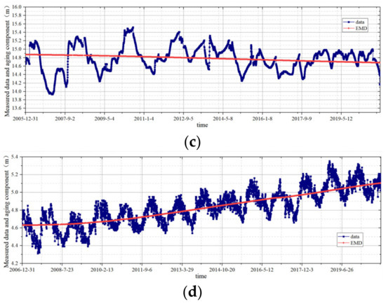 In summary, when constructing the aging component using the above approach, and considering the different operational states and environments of various hydraulic structures, it is necessary to take targeted measures for optimization. In this study, Empirical Mode Decomposition (EMD) is employed to decompose the aging component in the measured data. This allows for the establishment of a response function for the aging component in the dam, replacing Equation (5) in constructing a multi-source time series analysis model.