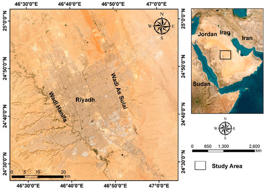 Map with an overview of Riyadh, covering an expansive 905 km2 area, with a focus on the prominent wadis Wadi Hanifan and Wadi As Sulai. The inset map in the top right corner provides the geographical context, pinpointing the study area’s location within Saudi Arabia.