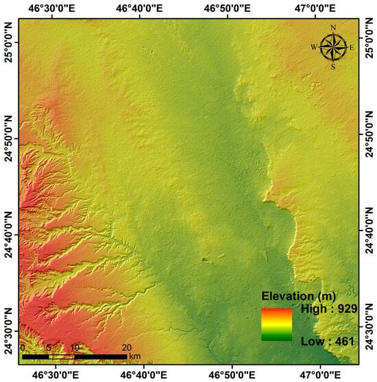 The digital elevation map (DEM) provided a grayscale shaded relief model of Riyadh, Saudi Arabia, revealing distinct elevation variations (Figure 3). Lighter areas signify higher elevations, while darker areas indicate lower elevations. The map illustrates a topography with high relief, with the highest point reaching 929 m above sea level and the lowest at 461 m. The western region has rugged, mountainous, or hilly terrain, suggesting steep slopes and significant disparities in elevation.
