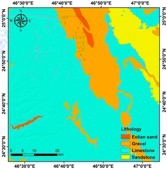 Lithological map delineating key geological features, showcasing the concentration of eolian sand in wadis, gravel in the central area, widespread limestone coverage, and sandstone along the eastern edges of the study area.