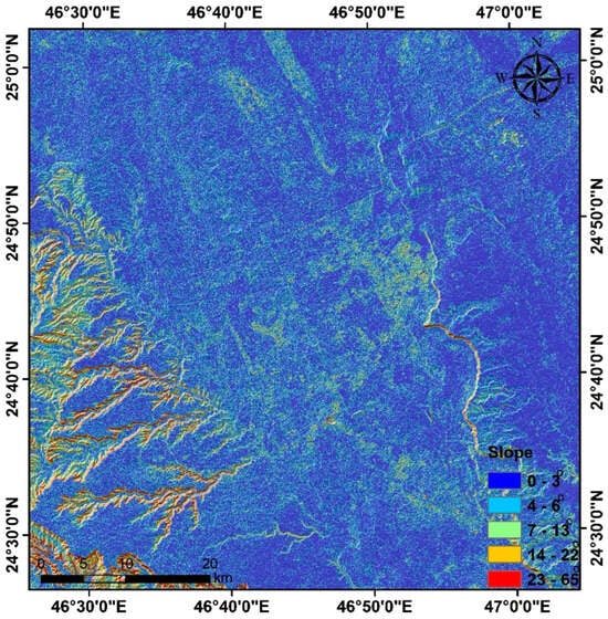 The slope map of Riyadh is crucial for comprehending the region’s topography (Figure 5). The map delineates various levels of inclination in the terrain, providing insights into the landscape’s characteristics. Areas with flat to very gentle slopes (0–3°) are predominantly flat, increasing the likelihood of water pooling and slower drainage, potentially leading to flooding during heavy rainfall. Regions with gentle slopes (4–6°) facilitate better water runoff compared with flatter areas but still pose a moderate risk of water accumulation. Areas with moderate slopes (7–13°) exhibit a moderate steepness, promoting more rapid surface runoff, reducing water retention, and heightening the risk of soil erosion. Steep slopes (14–22°) are susceptible to swift runoff and increased erosion, potentially causing the displacement of sediment and accelerated downstream water flow. Very steep slopes (23–65%) represent the steepest gradients in the area, where the velocity of runoff is at its maximum, escalating the risk of erosion and potentially triggering landslides under extreme weather conditions.