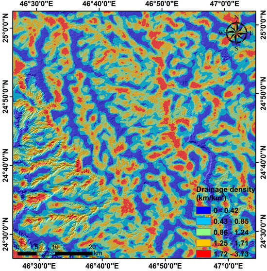 The analysis of the drainage density map for the specified study area in Riyadh offered crucial insights into the region’s hydrological characteristics (Figure 6). Drainage density, defined as the ratio of the total length of the valley network to the area it drains [38], serves as an indicator of an area’s capacity to manage surface runoff. Areas with low drainage density (0–0.42) feature sparse stream networks, which could limit the runoff capacity and potentially increase the risk of flooding. Moderate drainage density (0.43–0.85) suggests a somewhat enhanced drainage capability, enabling a more balanced hydrological response during precipitation events. Areas with substantial drainage density (0.86–1.24) are characterized by a relatively dense network of channels, which are conducive to efficient conveyance of water and could potentially reduce the risk of flooding. High drainage density (1.25–1.71) implies terrain that is capable of handling surface water, thereby reducing the likelihood of flooding. Very high drainage density (1.72–3.73) represents the most extensively drained areas where water is rapidly removed. While this could potentially mitigate flood risk, it also raises concerns about soil erosion and sediment transport. The map revealed a diverse drainage pattern across the study area, with areas of high-density drainage interspersed among zones of lower density. This variation may significantly influence the local flood dynamics, particularly during intense or prolonged rainfall events.
