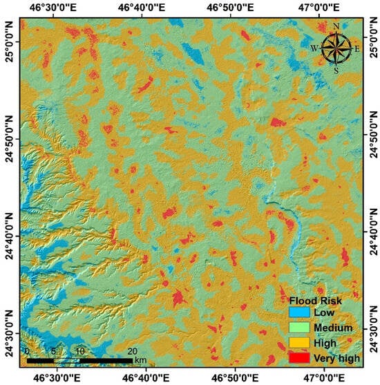 The flood risk map delineates various potential flood zones within Riyadh, classified into four risk levels: low, moderate, high, and very high (Figure 7). The total study area spans 905 km2, with 287, 283, 226, and 109 km2 categorized as low, moderate, high, and very high flood risks areas, respectively.