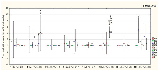 Mean values and standard deviations of overproduction of D. magna with statistical significance for satiated (F) and starved (H) conditions after one hour and 24 h at both temperatures in experimental setups with: D. magna and one (D1) or five (D5) individuals of D. gonocephala and P. felina; D. magna and one (E1) or five (E5) individuals of P. felina and green hydra; D. magna and one (F1) or five (F5) individuals of D. gonocephala and green hydra; D. magna and one (G1) or five (G5) individuals of P. felina, and the microalgae; D. magna and the microalgae (L). The symbols indicate statistically significant differences between the experimental setups: D5 and G5 in satiated conditions at 25 °C after 24 h (Δ); D5 and G5 in starved conditions at 25 °C after 24 h (#); F5 and G5 in starved conditions at 25 °C after 24 h (◊); F5 and G5 in satiated conditions at 25 °C after 24 h (¤); D1 and G1 in starved conditions at 25 °C after 24 h (*); E1 and G1 in starved conditions at 25 °C after 24 h (§); E5 and G5 in starved conditions at 25 °C after 24 h (Θ); F1 and G1 in starved conditions at 25 °C after 24 h (Σ); F5 and G5 in starved conditions at 25 °C after 24 h (β), and within the same experimental setup; E1, satiated conditions at 13.5 °C and starved conditions at the lower temperature after 24 h (◦); G1, satiated and starved conditions at the higher temperature after 24 h (Φ); and G1, in starved conditions at the higher temperature after one hour and 24 h (Ж).
