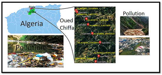 Over a period of 12 months, a rigorous sampling campaign was conducted daily at the highly polluted surface water site of Oued Chiffa, situated between the regions of Médéa and Blida. Each day, one liter of water was collected from various points within the contaminated area to ensure the representativeness of the samples. At the end of each month, a composite sample of 30 L was created from these daily collections. The specific choice of this site was motivated by its elevated levels of pollution, aiming to assess the effectiveness of coagulation processes in an intensely contaminated environment. It is noteworthy that, during the initial phase of the study, samples were taken from different locations each day. However, for the remainder of the months, the samples were collected from the same locations, in accordance with the indications provided in Figure 1. The study year was 2019, and samples were systematically collected from January to December 2019, providing a comprehensive dataset for analysis.