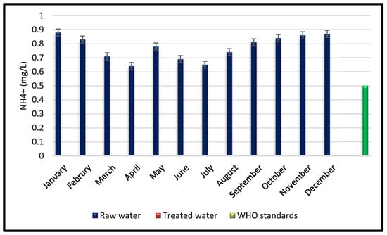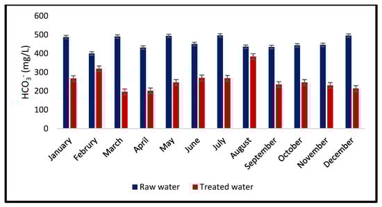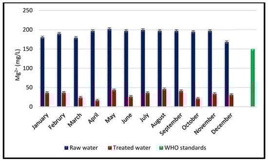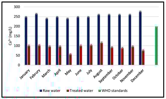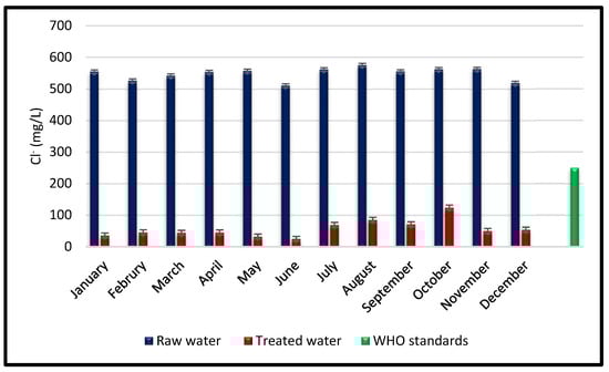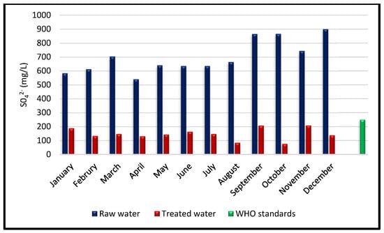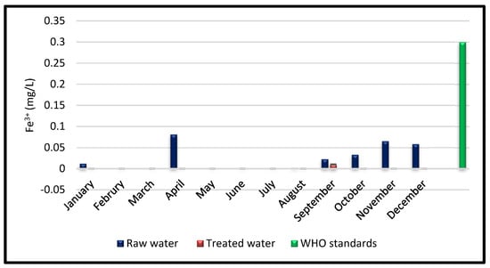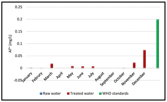 As depicted significantly in Figure 3, the electrical conductivity values exhibited noteworthy variations between the raw and treated water samples. Raw water samples showed a wide range of conductivity, ranging from 2870 to 3410 μS/cm each month (Figure 3). It should be emphasized that these values exceeded the maximum limit set by the World Health Organization (WHO) standards, which was established at 2800 μS/cm. However, a detailed examination of the data in Figure 3 reveals a distinct tendency of obtained values for treated water to remain below those of raw water, especially concerning the maximum value, which slightly exceeds 1000 μS/cm. The action of Al2(SO4)3 has thus significantly contributed to the reduction in electrical conductivity levels for treated water. In harmony with the findings of Rodier et al., it is established that a conductivity exceeding 600 μS/cm indicates substantial mineralization of waters, a feature clearly evident in the case of treated water [47]. Guidelines set by USEPA highlight that electrical conductivity tends to maintain relative stability within a distribution network, provided the balance with pipe materials is upheld. Substantial conductivity variations, as clearly illustrated by the comprehensive comparison between raw water and treated water conductivity levels (Figure 3), could potentially signal issues related to corrosion [41,50].