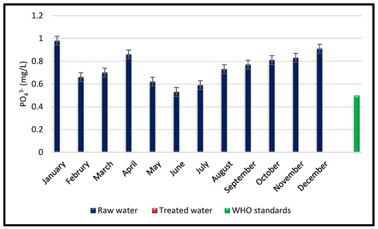 The graphical representations depicting organic matter concentrations in both untreated and treated water samples have been meticulously crafted, unveiling a wealth of intricate details within Figure 5. Expanding upon the insights gleaned from the analysis conducted in Figure 5, it becomes increasingly apparent that organic matter values in the untreated water samples exhibit significantly elevated levels, with a striking range spanning from 20.5 to 29.2 mg/L. This range of measurements naturally beckons further investigation into whether these values align with global regulatory standards. Nevertheless, the most pivotal observation emerges from the treated water samples (Figure 5), where the rigorous implementation of the Al2(SO4)3 coagulation–flocculation process [41,61] culminates in a remarkable reduction in organic matter levels. The results unequivocally demonstrate that the coagulation–flocculation process with Al2(SO4)3 has achieved an impressive reduction in organic matter, reaching an outstanding rate of 99.62%. This figure undeniably confirms the unquestionable effectiveness of this method in diminishing organic matter levels in treated water.