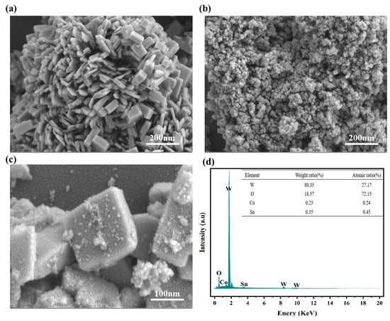 The morphology of various materials is characterized in Figure 1a–c. Pure WO3, obtained through the hydrothermal-calcination method, exhibited a smooth-surface stack of nanobricks measuring approximately 300–500 nm in length and width, and a height of about 50–300 nm (Figure 1a). Each nanobrick can serve as a support, providing an optimal contact interface for loading with other semiconductors to construct heterojunctions. Figure 1b displays the morphology of Co2SnO4, which was a was spherical nanoparticle in the diameter range of 20–30 nm. After the combination of WO3 and Co2SnO4, numerous secondary Co2SnO4 nanoparticles can be observed to grow epitaxially on WO3 nanobricks, making the surface of WO3 nanobricks rough (Figure 1c). That indicated that the formation of a large number of heterojunction interfaces was conducive to shortening the ion diffusion and reaction distance. Subsequently, as illustrated in Figure 1d, the existence of W, Co, Sn, and O elements in the materials was ascertained via EDS analysis on the WO3@Co2SnO4 composite, which suggested that WO3 nanobricks were successfully combined with Co2SnO4 nanoparticles.