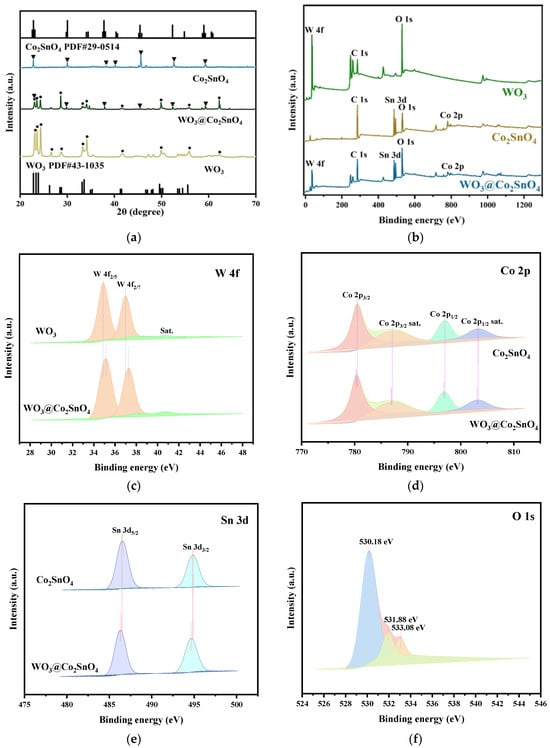 XPS analysis was carried out to investigate the chemical constitution and surface states of WO3, Co2SnO4, and WO3@Co2SnO4. Figure 2b illustrates the survey XPS spectra obtained for WO3, Co2SnO4, and WO3@Co2SnO4. In the composite WO3@Co2SnO4, distinct peaks corresponding to W, Sn, O, and Co peaks were observed consistently with the EDS results. Additionally, the reference peak at 284.8 eV in all survey spectra corresponded to C 1s. Figure 2c–f illustrates detailed scans of W 4f, Co 2p, Sn 3d, and O 1s peaks in pure materials and WO3@Co2SnO4 composite in sequence. Two peaks at 34.88 eV and 36.98 eV in Figure 2c correspond well to the W6+ states of W 4f5/2 and W 4f7/2, respectively. The binding energy peaks at 780.28 eV and 796.98 eV in Figure 2d can be ascribed to Co 2p3/2 and Co 2p1/2 states, which was consistent with the results for Co2+ [29]. Furthermore, the satellite peaks located at 787.08 eV and 803.18 eV were associated with Co 2p3/2 and Co 2p1/2 states [26,30]. The peaks at 486.15 eV and 494.48 eV belonged to Sn 3d5/2 and Sn 3d3/2 states, respectively. The O 1s binding energy peaks were detected at three different values: 530.18 eV, 531.88 eV, and 533.08 eV, corresponding to Metal-O (M-O), O-H of H2O, and absorbed O, respectively. Based on the XPS analysis results, it can be observed that Co2SnO4 was incorporated into the heterogeneous structure of WO3. During the heterojunction formation process, there was an increase in electron cloud density around the semiconductor, resulting in a negative shift in XPS spectral peaks while the semiconductor exhibited positive shift in its XPS spectra peaks. In the case of WO3@Co2SnO4 composite, there was a positive shift in binding energy for W 4f, and both the binding energy of Co 2p peaks and that of Sn 3d peaks were shifted negatively. All these XPS results collectively indicated successful construction of heterojunction.