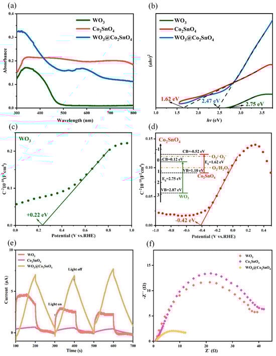 The optical properties of semiconductor materials were crucial factors for the performance of PEC systems. Figure 3a illustrated the UV–Vis absorption spectra of WO3, Co2SnO4, and WO3@Co2SnO4, demonstrating enhanced absorption in the UV–Vis range after combing WO3 with Co2SnO4. Additionally, there was a red shift in the absorption range along with a broad peak spanning from 550 to 650 nm. The incorporation of Co2SnO4 into WO3 was inferred to significantly broaden the absorption region, indicating enhanced light-absorption capabilities. As displayed in Figure 3b, the band gap energy (Eg) for WO3, Co2SnO4, and WO3@Co2SnO4 calculated using the Kubelka–Munk function equation [31] were 2.75 eV, 1.62 eV, and 2.47 eV, respectively. This suggested introduction of Co2SnO4 reduced the band gap of WO3 and noticeably improved its light-absorption ability.
