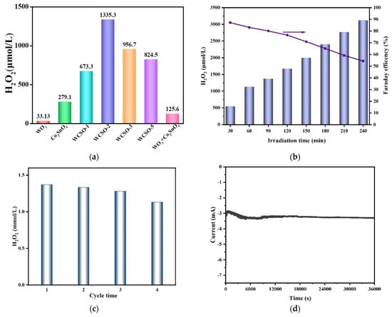 The recycling stability for an electrode was one of the important criteria to evaluate the quality. The recyclability of the as-prepared WO3@Co2SnO4 photocathode was investigated for four cycles in Figure 4c, which exhibited that the yield of H2O2 still can reach more than 1 mmol·L−1 in the four cycles. Figure 4d demonstrated that the photocurrent remained stable for 36,000 s. The results above showed that the WO3@Co2SnO4 photocathode had satisfied stability and can be reused many times.