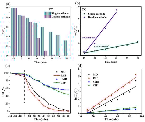 Firstly, the effect of different cathode systems, namely the single-cathode system and double-cathode system, was investigated for the degradation of tetracycline (TC). The PEC degradation of TC was conducted in a 20 mL solution containing 10 mg·L−1 TC with saturated oxygen (0.1 mol·L−1 Na2SO4, pH = 3). As shown in Figure 5a, the degradation efficiency of TC in a double-cathode system reached 96% for PEC 60 min and achieved complete degradation after PEC 75 min. In contrast, the single-cathode system only exhibited a degradation efficiency of 47% for PEC 90 min. These confirmed that the double-cathode configuration outperformed the single-cathode configuration in terms of PEC degradation of pollutants. Meanwhile, the constant of apparent reaction rates of the two different systems were calculated and illustrated in Figure 5b, which indicated that the PEC degradation reaction rate was obeyed by the linearly correlated slopes. The double-cathode system displayed the faster reaction rate, and the apparent kinetic rate constant was 0.07565 min−1 which was obviously higher than the single-cathode system (0.01153 min−1). It was illustrated that the introduction of SSM accelerated the PEC degradation reaction, and further verified that the double-cathode system can prompt the ·OH generation to improve the degradation effect of TC.