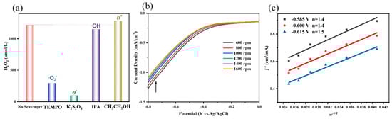 Furthermore, a rotating ring disk electrode (RRDE) was employed to record and calculate the number of e− transfers (n) in the PEC H2O2 production process. The linear sweep voltammetry (LSVs) at different scan rates on RRED was measured in an O2—saturated buffered of 0.1 mol·L−1 Na2SO4 (pH of 3) with the scan rates range of 600–1600 rpm (Figure 6b). As displayed in Figure 6c, based on the Koutecky-Levich (KL) equation (1/j = 1/jk + kw − 1/2) [36,37], the number of e− transfers (n) at the voltages of −0.585 V, −0.600 V, and −0.615 V was 1.4, 1.4, and 1.5, respectively, indicating both one-electron and two-electron transfer existed during the process of PEC H2O2 production. Namely, the direct one-step two-electron ORR coexisted with the indirect two-step one-electron ORR process. These results were consistent with those of free radical trapping experiments.